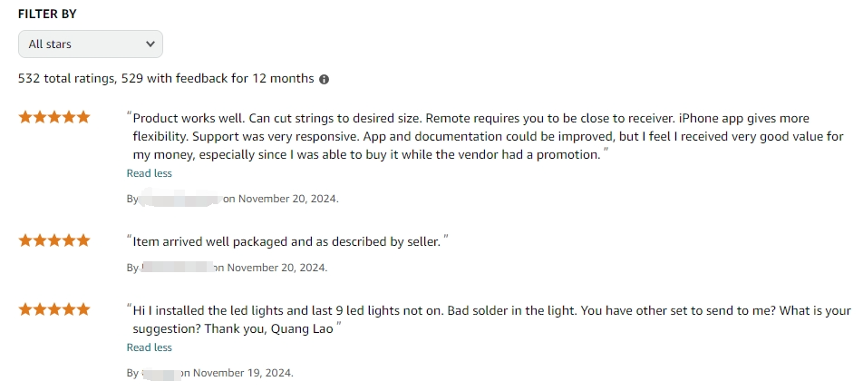 自入驻亚马逊平台以来,该店铺累积获得了共计2017份用户评价,总体评分高达4.9颗星,其中五星级别占比更是达到了令人惊叹的88%。而在过去的一整年内,产品共收到了741条反馈信息,好评率同样高达100%,直至本月19号仍有少量顾客给予满星赞赏。