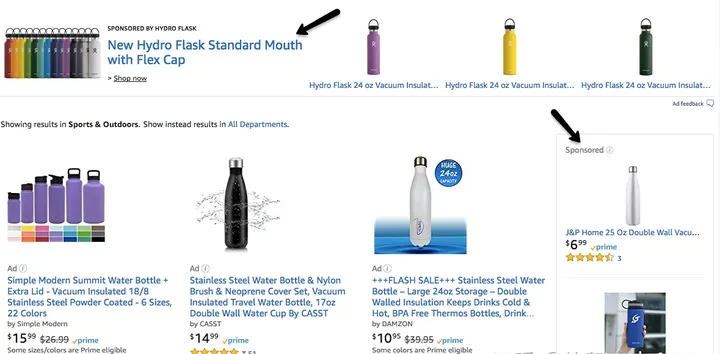 与谷歌搜索广告类似,当您在亚马逊搜索框中输入关键字并显示结果时,一些排名靠前的结果将是赞助帖子这些被视为亚马逊广告。它们用微妙的赞助或广告文字表示,如下图所示。