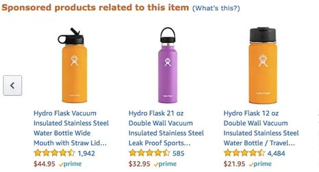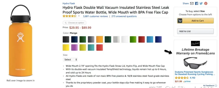 亚马逊广告也可以出现在单个产品页面上。例如,当查看下面的水瓶时,我可以看到页面最右侧的太阳镜添加项。