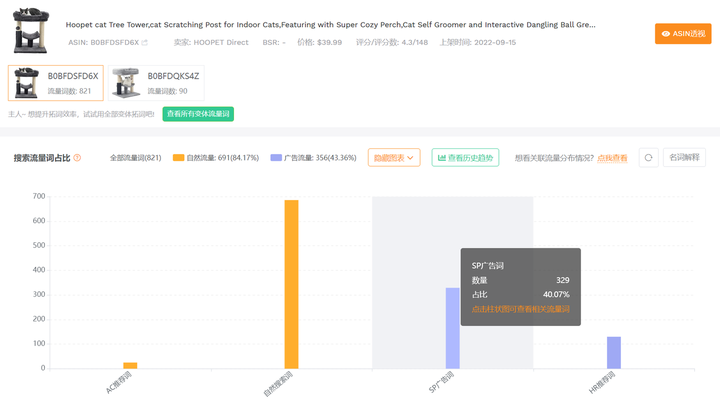 这款产品的自然流量和广告流量大概是2:1的比例,近30天进入过搜索结果前3页的SP广告词有329个。