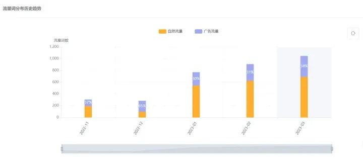 从流量词的历史分布趋势来看,自然流量和广告流量的占比也一直稳定在7:3,属于比较健康的流量结构,作为小类的头部产品来说,有一定的参考意义。