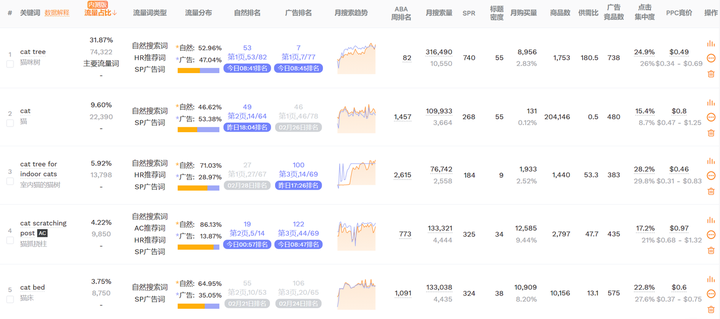 在本案例中,前5个关键词给该ASIN带来了超过55%的广告流量,其中大词cat tree独占31%的广告流量。并且cat tree一词的自然排名已经基本稳定在了搜索结果的第1页,而广告排名则相对较为稀疏。同时,流量占比前6-10的关键词基本都是长尾词,并且广告排名出现在搜索结果前3页的频率较高。