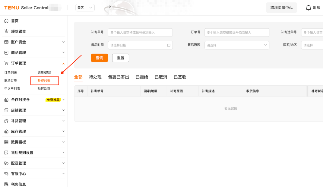 模块功能:当用户进线联系平台客服要求处理商品少件、补寄时,客服会向商家发送工单,工单中含用户补寄地址,48小时可见,商家需要在1个工作日内回复是否可以补寄、补寄单号等信息。同时,用户也可以自主发起补寄,商家在后台审核和操作补寄,需要在7个自然日内同意补寄并上传运单信息,超时将自动拒绝补寄。