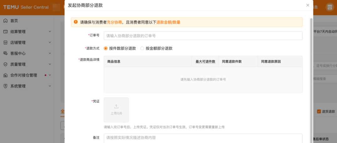 模块功能:商家根据协商结果,输入需要部分退款的用户订单。选择退款方式为【部分件数】/【部分金额】,补充件数/金额,凭证(凭证一般是和用户协商一致的聊天截图)以及备注,提交申请。确认完成后,触发部分退款,自动生成一笔售后单;用户侧收到部分退款金额,提示原因为协商一致退款。(注意:如果订单已经存在退货退款的售后单,需要先取消那笔售后单,才能发起协商部分退款。)