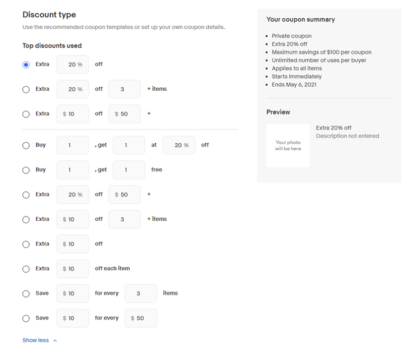 - Coded Coupon可在eBay多个位置公开或私下分享,而Codeless Coupon只能向特定买家推送。