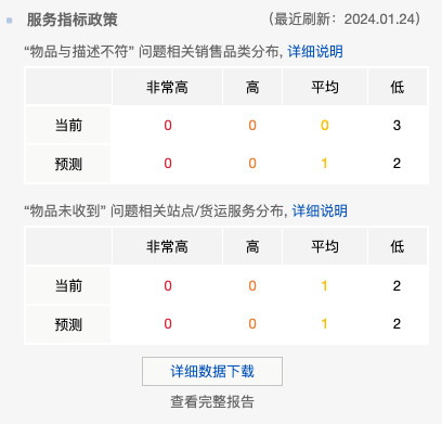 服务指标政策模块service metrics,它包含“物品与描述不符”和“物品未收到”等指标,帮助卖家及时掌握评估数据。
