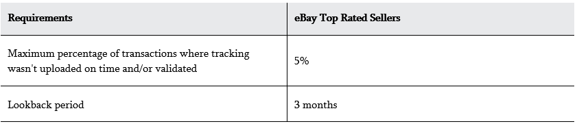 如果卖家在规定的处理时间内上传跟踪详细信息,并且承运人在处理时间前扫描了装运标签,则交易将按时完成并得到验证。Top rated等级卖家的最大未及时上传跟踪单号率为5%。
