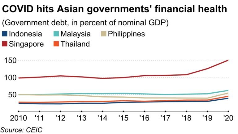 经济数据提供商CEIC的数据也指向了同样的问题,和马来西亚、菲律宾等国一样,新加坡政府债务与名义GDP的比率在2020年上升至150%,其中名义GDP是显示财政健康状况的一个指标,而2019年和2018年分别为126%和108%。