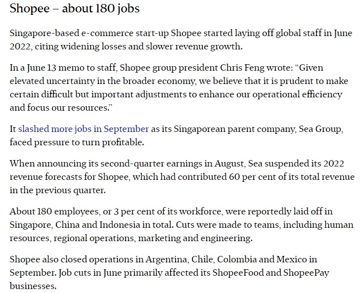 而根据此前报道,目前Shopee在新加坡和印度尼西亚等地,总共裁员了大约180名员工,占其员工总数的3%,还有不少招聘岗位也已经被撤下。