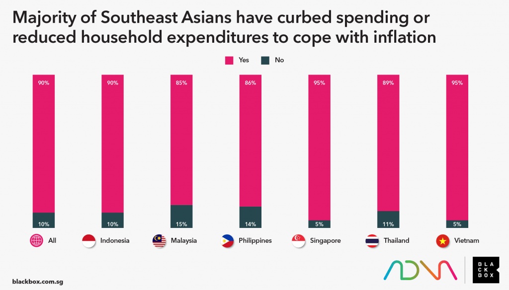 除了人员频繁裁减之外,通货膨胀的压力也在影响消费者的支出计划。根据Blackbox-ADNA的最新研究,90%的东南亚受访者在过去半年中都削减了开支,以应对不断飙升的通货膨胀。