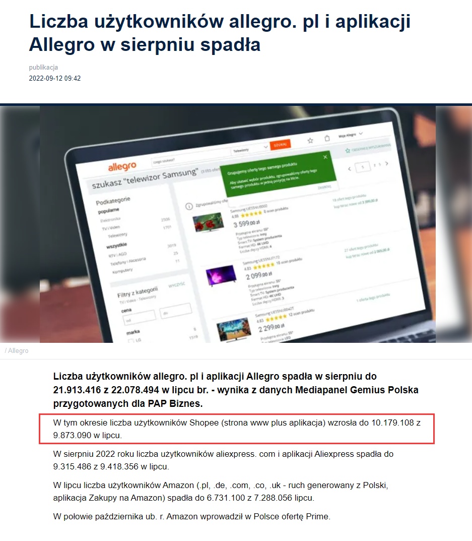 Mediapanel Gemius Polska调查结果显示,Shopee在波兰买家数量(网站+应用程序)从7月份的9,873,090人增加到8月的10,179,108人。