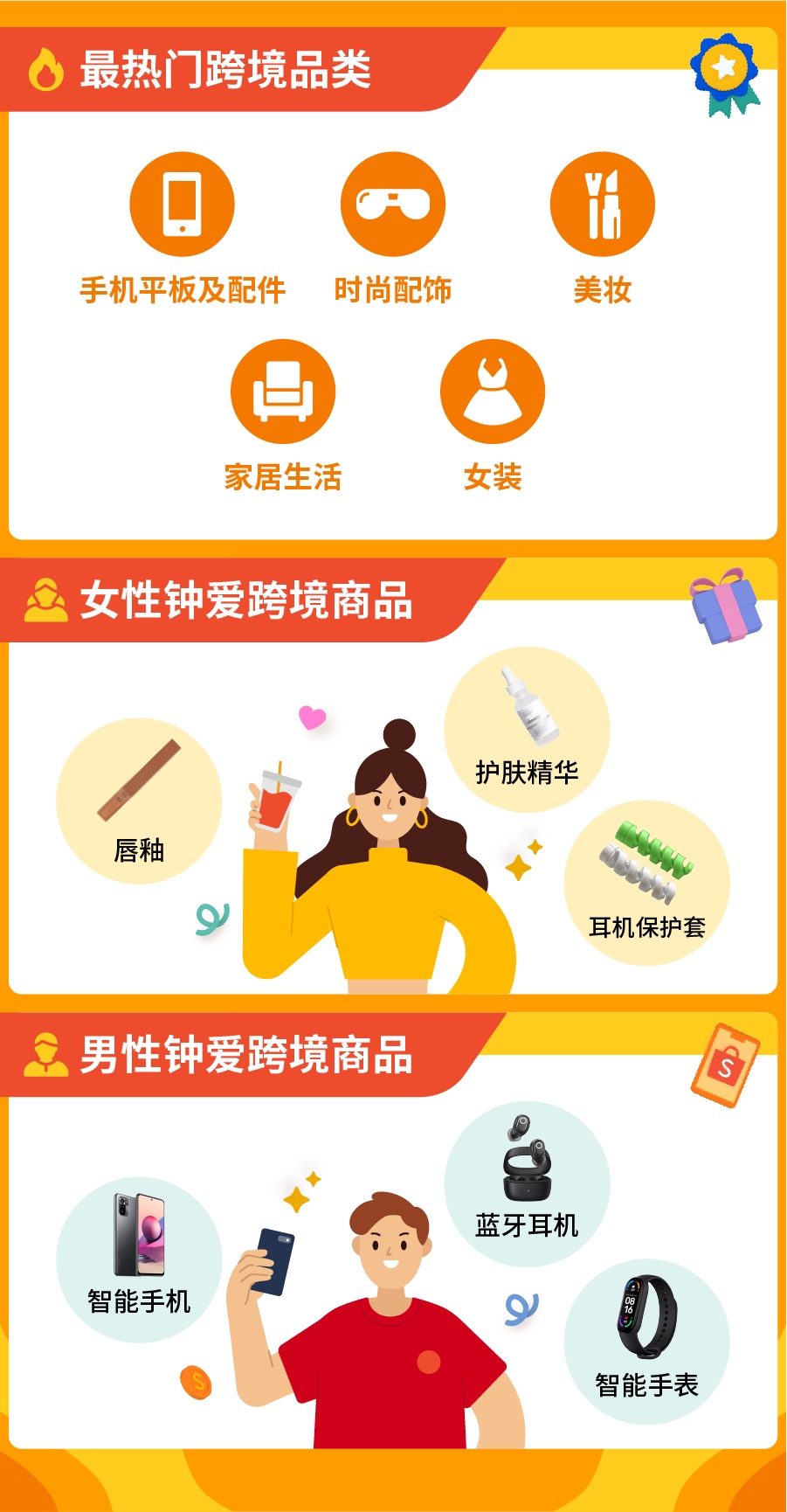 数据显示,此次9.9大促活动中,女性消费者更偏爱唇釉、护肤精华、耳机保护套这类跨境商品;男性消费者更偏爱智能手机、蓝牙耳机和智能手表这类跨境商品。