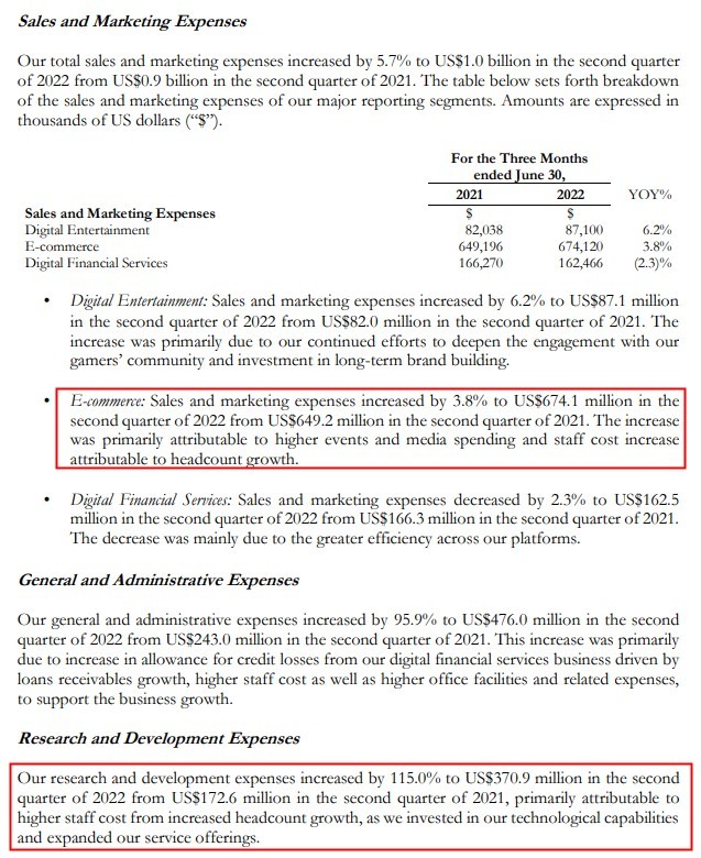 Sea在第二季度的总营收成本达19亿美元,同比增加37.2%;电商和其他服务部门的收入成本达13亿美元,同比增长62.8%,增长的原因是物流费用增加。