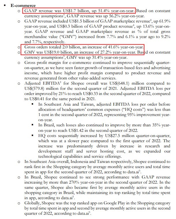 在巴西,Shopee继续保持强劲表现,2022年第二季度GAAP收入同比增长超过270%,同一季度,Shopee也成为巴西购物类别的月均活跃用户第一,同时根据data.ai的数据,在应用程序使用总时长方面保持其最高排名。
