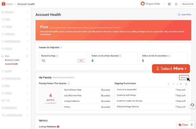 如卖家要提交申诉,请进入卖家中心的账号健康页面并在“我的计分”(Penalty Points)处选择“更多”(More)。在计分行动(Action)栏下,在卖家想上诉的处罚旁点击“查看违规”(View Violation)。然后在处罚页面选择“在此申诉”(Appeal Here)。