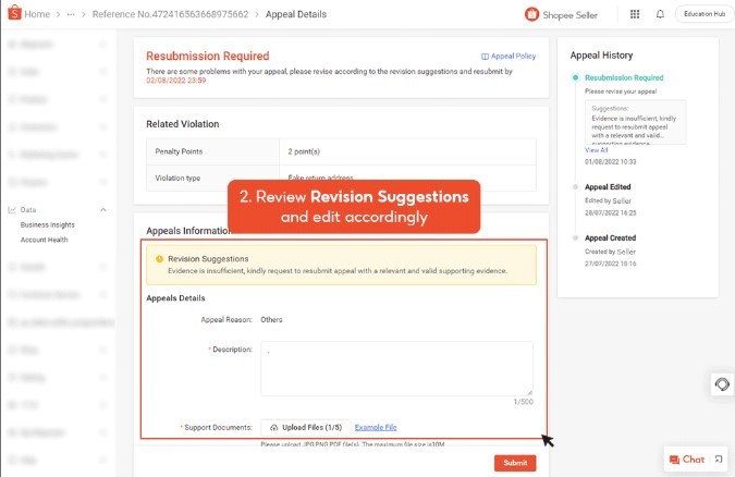 卖家可以在“我的计分”页面管理提交的申诉并快速查看所有申诉状态。如果卖家的计分申诉状态是需要重新提交(Resubmission Required),选择行动(Action)栏中的“编辑申诉”(Edit Appeal)。查看“申诉信息”(Appeals Information)中的“修改建议”(Revision Suggestions)并进行调整。