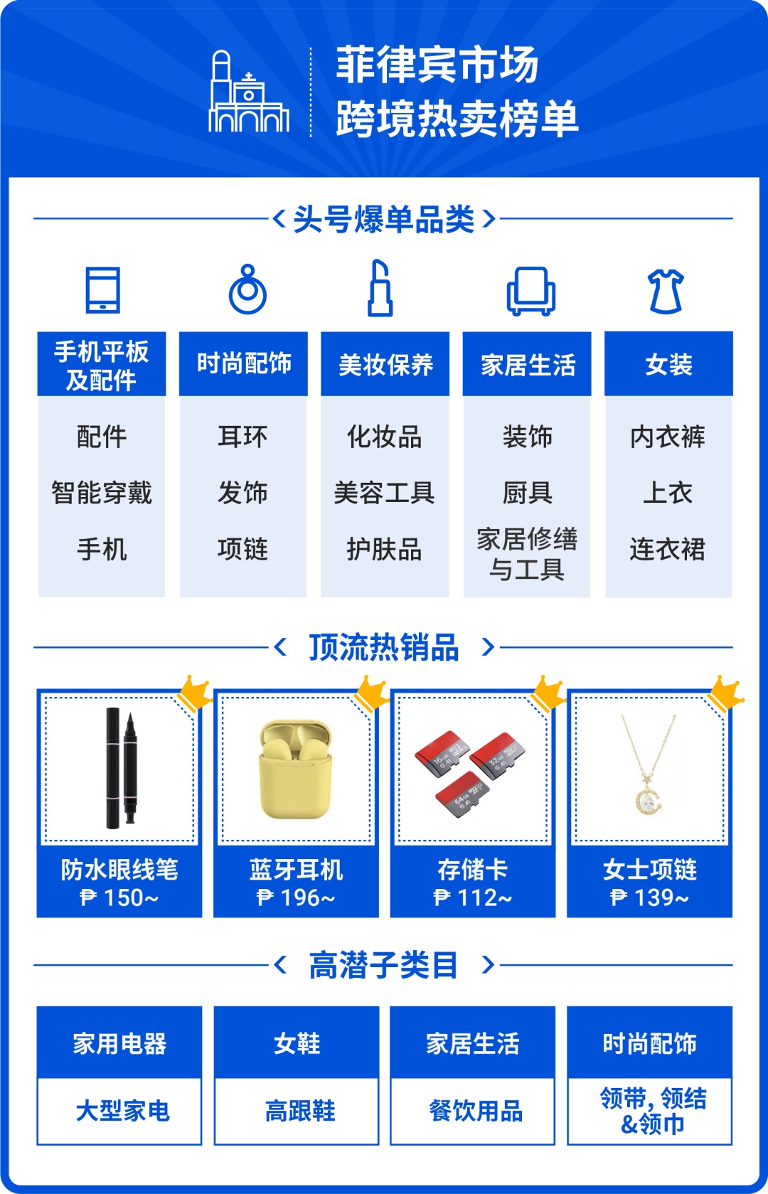 菲律宾市场的高潜子类目包括大型家用电器、女性高跟鞋、餐饮用品、领带、领结&领巾;顶流热销品包括防水眼线笔、蓝牙耳机、存储卡、女性项链。
