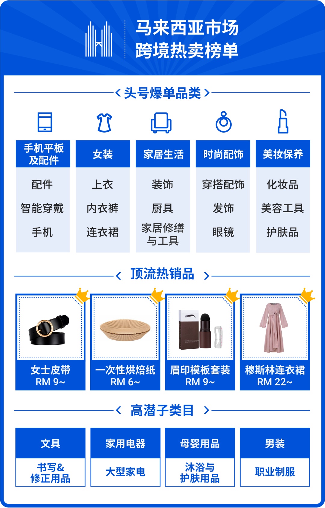 马来西亚市场的高潜子类目包括书写&修正用具、大型家电、沐浴与护肤用品、男性职业制服;顶流热销品包括女性皮带、一次性烘焙纸、眉印模板套装、穆斯林连衣裙。