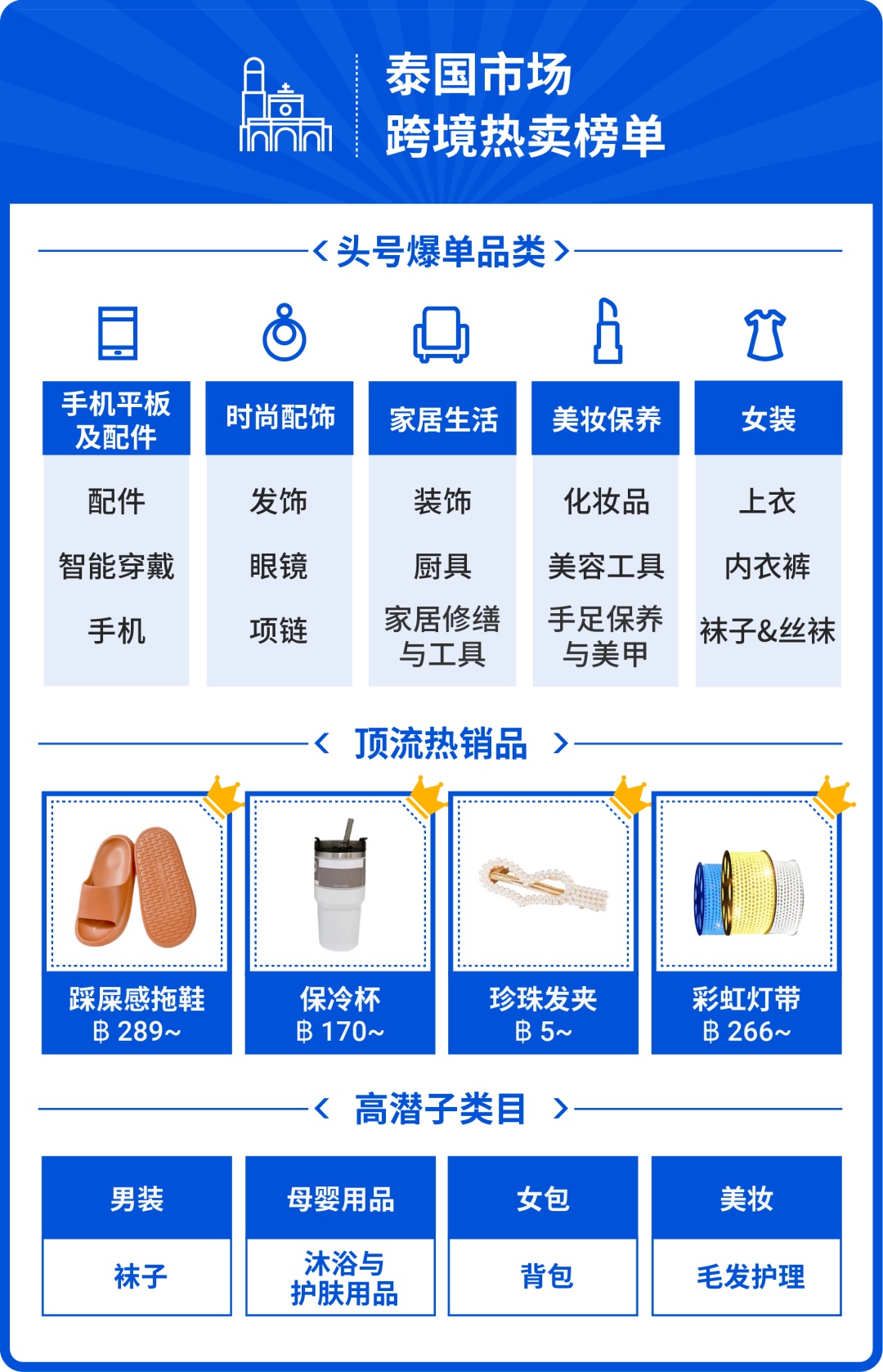 泰国市场的高潜子类目包括男装袜子、沐浴与护肤用品、女性背包、毛发护理;顶流热销品包括踩屎感拖鞋、保冷杯、珍珠发夹、彩虹灯带。