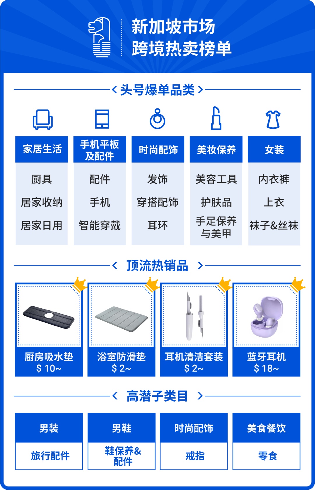 新加坡市场的高潜子类目包括旅行配件、男鞋保养及配件、戒指、零食。顶流热销品包括厨房吸水垫、浴室防滑垫、耳机清洁套装、蓝牙耳机。