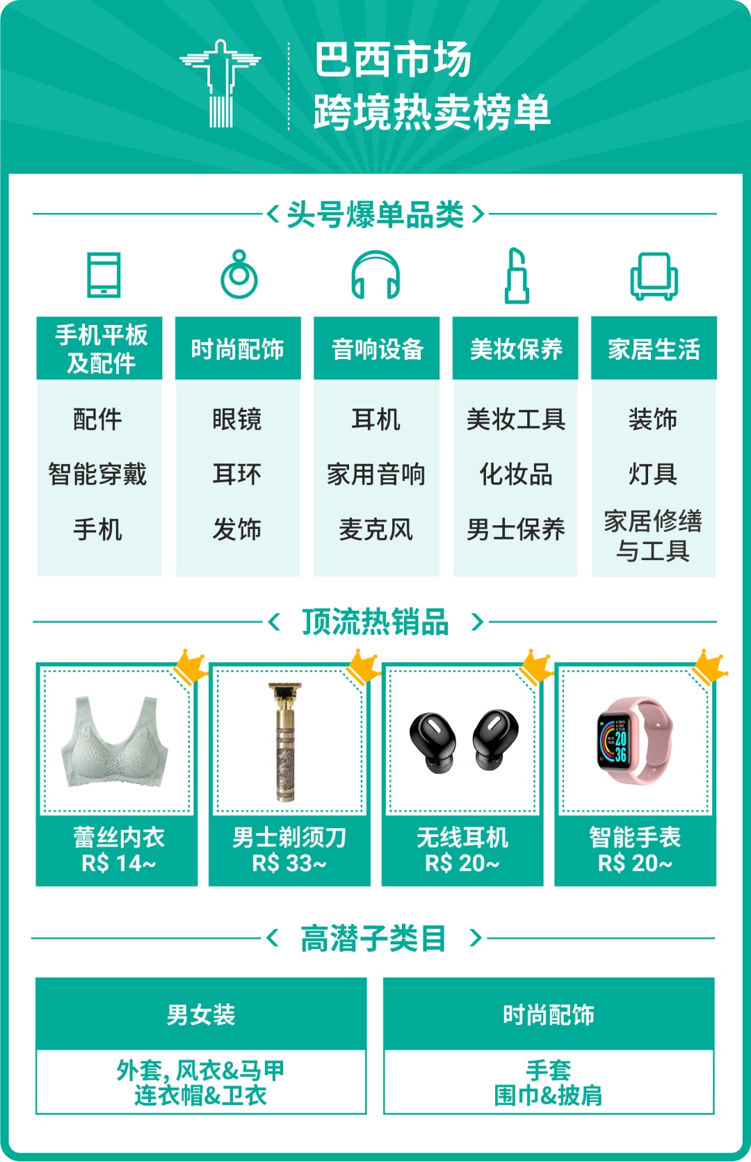 巴西市场的高潜子类目包括外套、风衣&马甲、连衣帽&卫衣、手套、围巾&披肩;顶流热销品包括蕾丝内衣、男士剃须刀、无线耳机、智能手表。