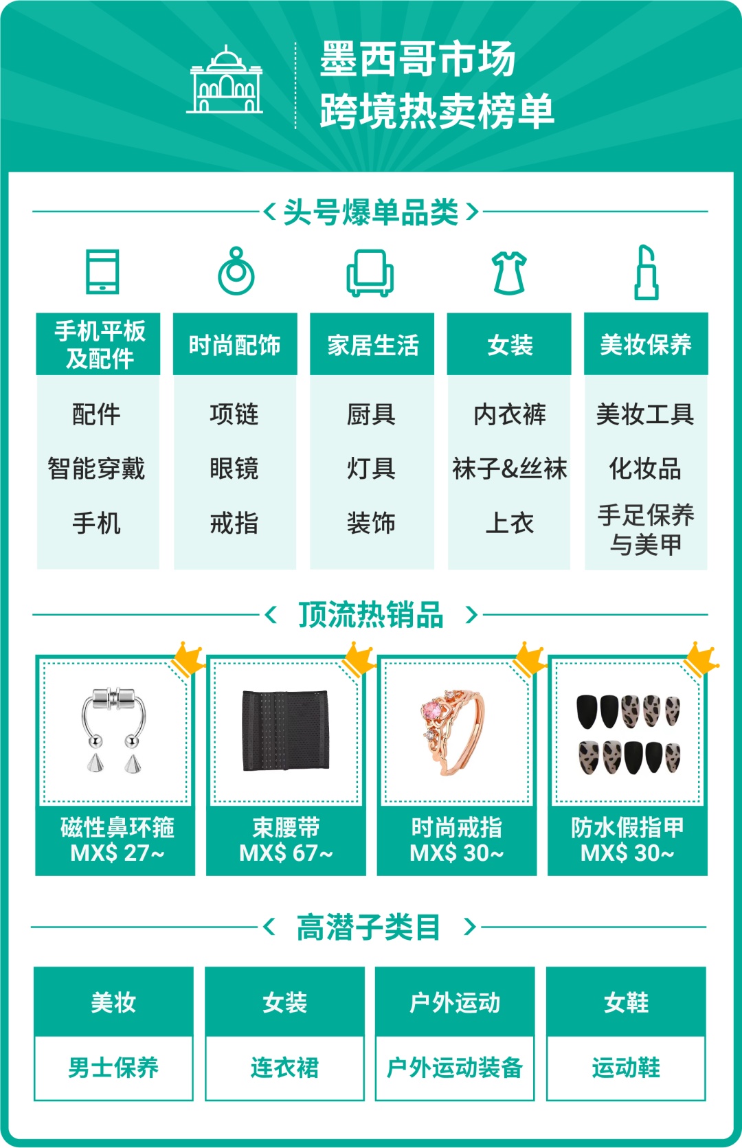 墨西哥市场的高潜子类目包括男士保养品、连衣裙、户外运动设备、女性运动鞋;顶流热销品包括磁性鼻环箍、束腰带、时尚戒指、防水假指甲。