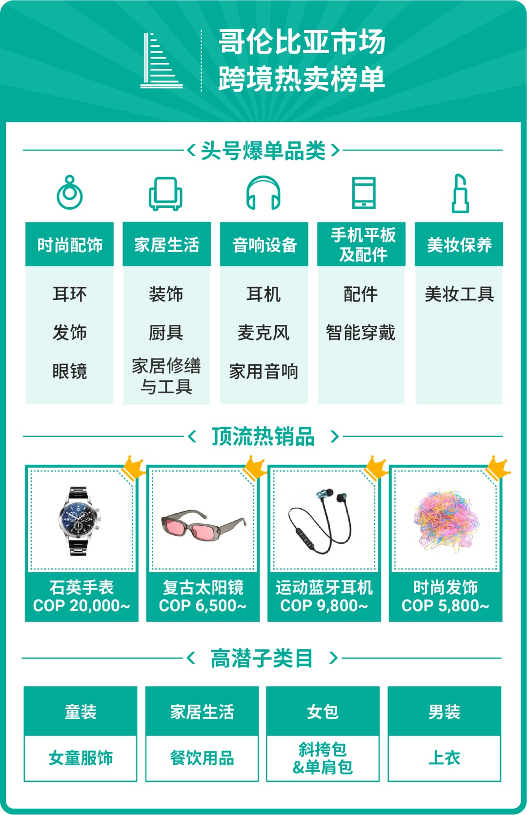 哥伦比亚市场的高潜子类目包括女童服饰、餐饮用品、斜挎包&单肩包、男性上衣;顶流热销品包括石英手表、复古太阳镜、运动蓝牙耳机、时尚发箍。