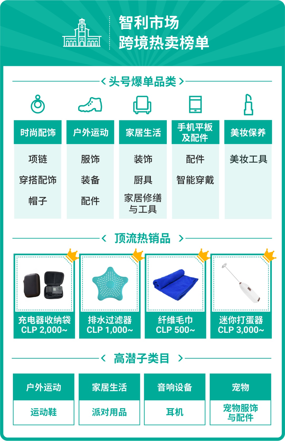 智利市场的高潜子类目包括户外运动鞋、派对用品、耳机、宠物服饰与配件;顶流热销品包括充电器收纳袋、排水过滤器、纤维毛巾、迷你打蛋器。