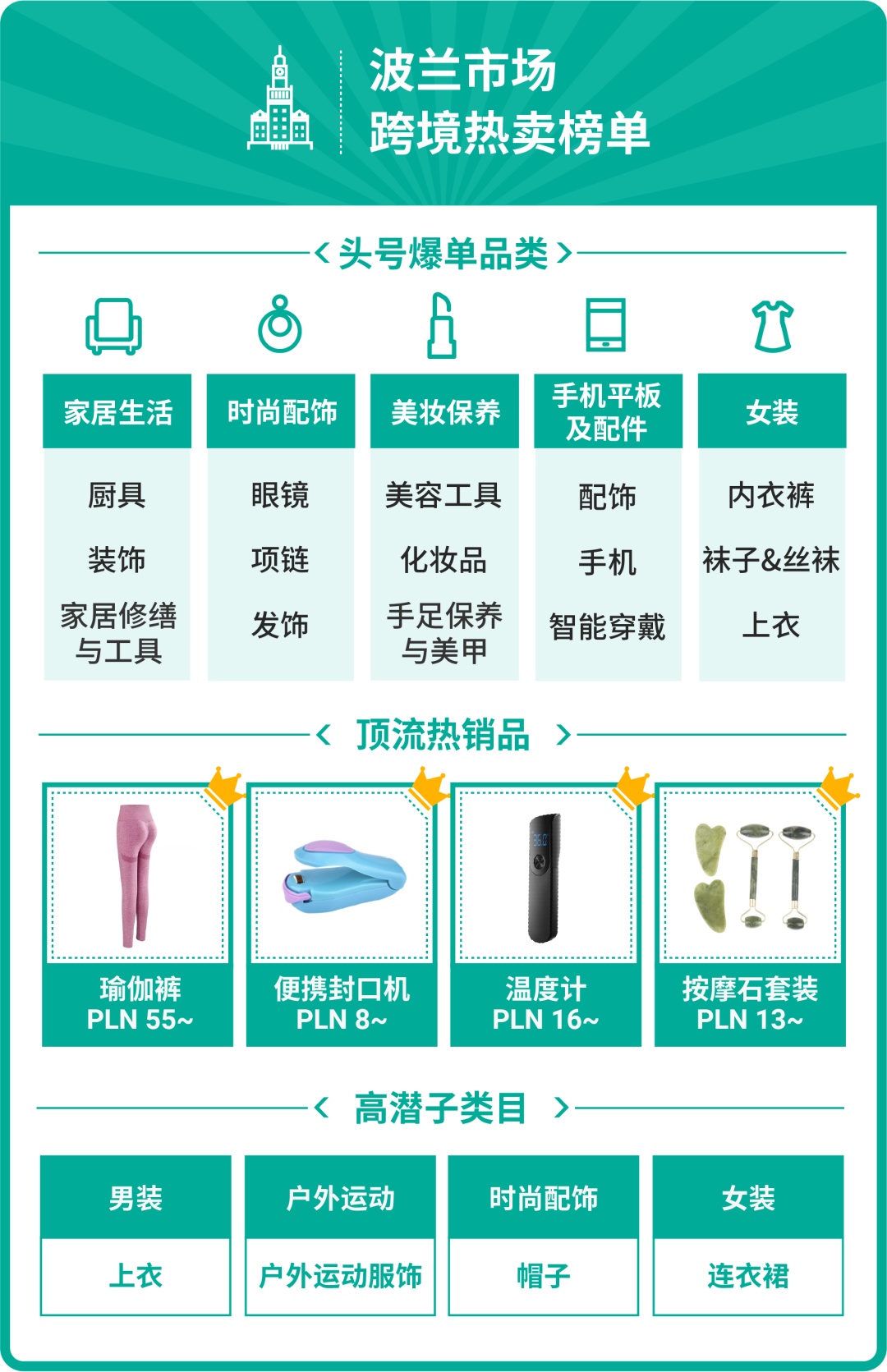 波兰市场的高潜子类目包括男性上衣、户外运动服饰、帽子、连衣裙。顶流热销品包括瑜伽裤、便携封口机、温度计、按摩石套装。