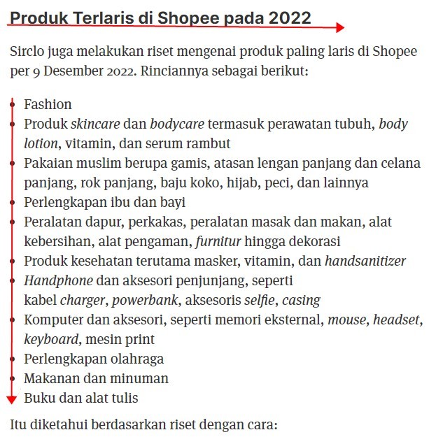 此外,根据Sirclo对截止2022年12月9日Shopee畅销商品的调查,最畅销产品包括:时尚、护肤和身体护理产品包括身体护理、润肤露、护发素;长袍、长袖上衣和长裤、长裙、koko衬衫、头巾、帽子等形式的穆斯林服装、母婴产品、厨房家电、工具、炊具和餐具、清洁设备、安全装置、家具、装饰品,口罩、维生素和洗手液;手机及配套配件如充电线、移动电源、自拍配件、手机壳;计算机和配件,例如外部存储器、鼠标、耳机、键盘;打印机、运动装备、书籍和文具。