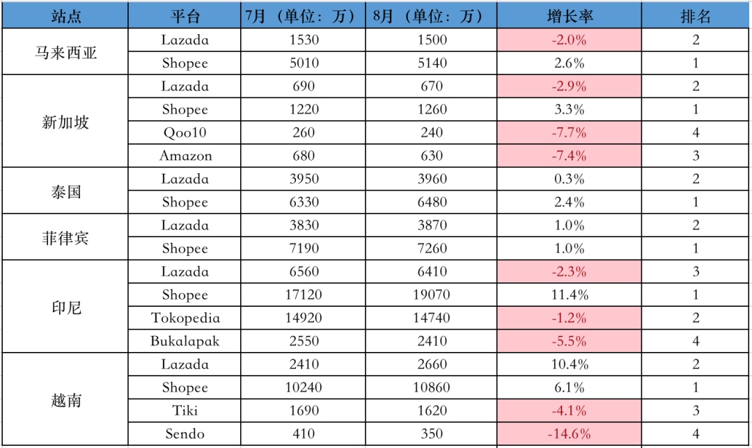 此外,东南亚其他本土和国际电商平台数据出现了一致下跌,最高跌幅为14.6%。