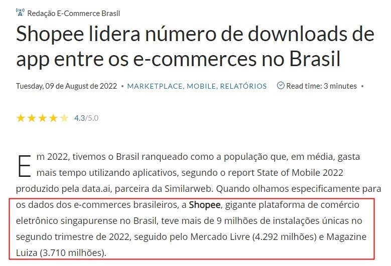 在巴西排名前十的电商平台中,Shopee的下载量所占份额为20.2%。