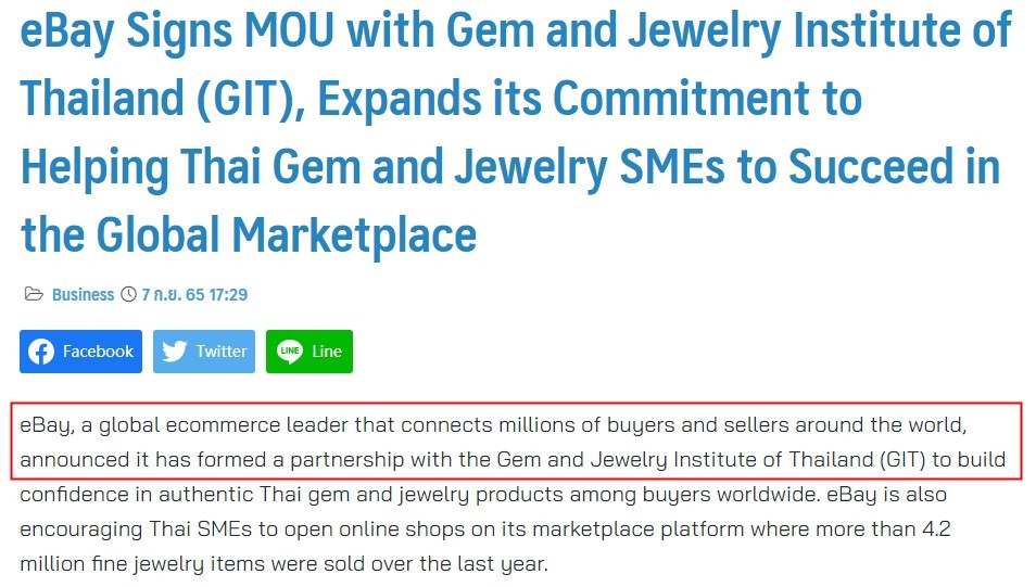 近日,eBay宣布与泰国珠宝学院(GIT)建立合作伙伴关系,助力泰国宝石和珠宝中小企业走向全世界。