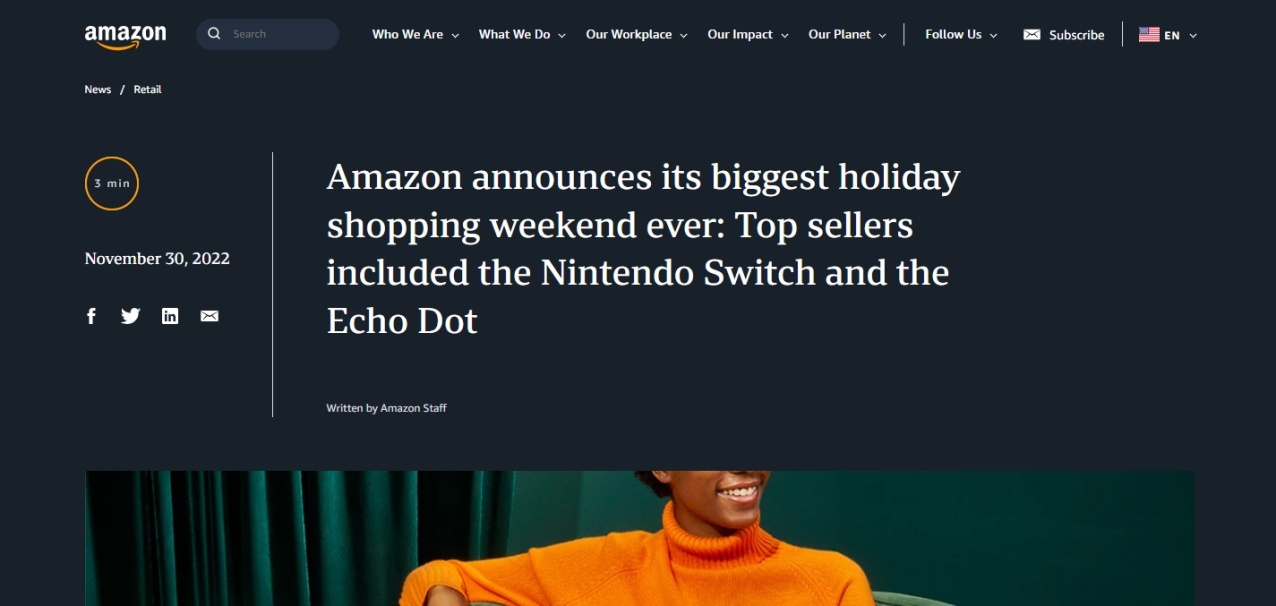 亚马逊近日也宣布,刚刚结束的黑色星期五和网络星期一再次打破销售记录。大促活动期间,全球范围内的消费者在亚马逊上购买了数亿件商品,创下新高。