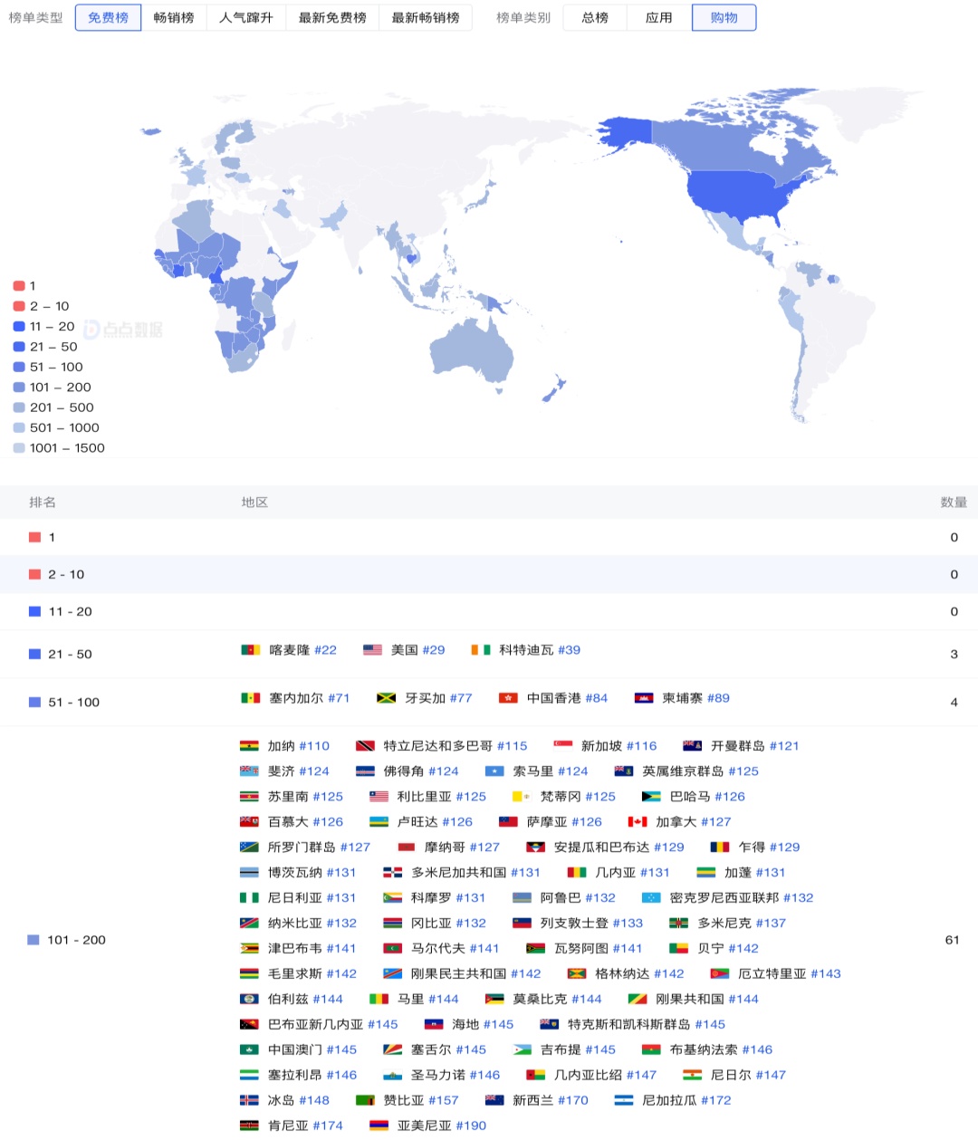 有关数据统计,非洲至少有631个实体商品B2C在线市场,中国商家占据非洲电商平台主导地位。另外,DataSparkle数据显示,非洲地区购物类应用活跃度排行榜中,中国商家比例达60%。而被视为Temu“直接竞对”的SHEIN早在2022年5月就进军了非洲摩洛哥,目前已进入非洲购物类应用排行榜单。