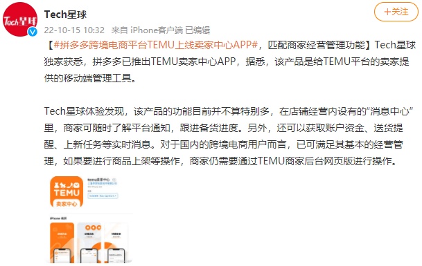 Tech星球独家获悉,拼多多已推出TEMU卖家中心APP,据悉,该产品是给TEMU平台的卖家提供的移动端管理工具。
