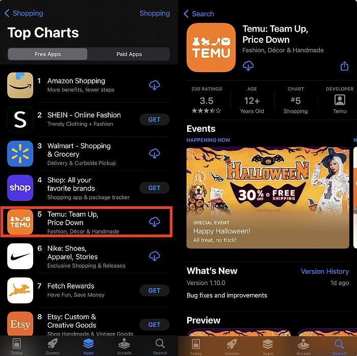 目前,拼多多的跨境电商平台TEMU,已经在美国的苹果商店购物类APP中排名非常靠前。据界面新闻报道,截至目前,Temu在美国的苹果商店购物类APP中排名已冲至第5位,前四名分别是Amazon Shopping、SHEIN、Walmart以及Shop。