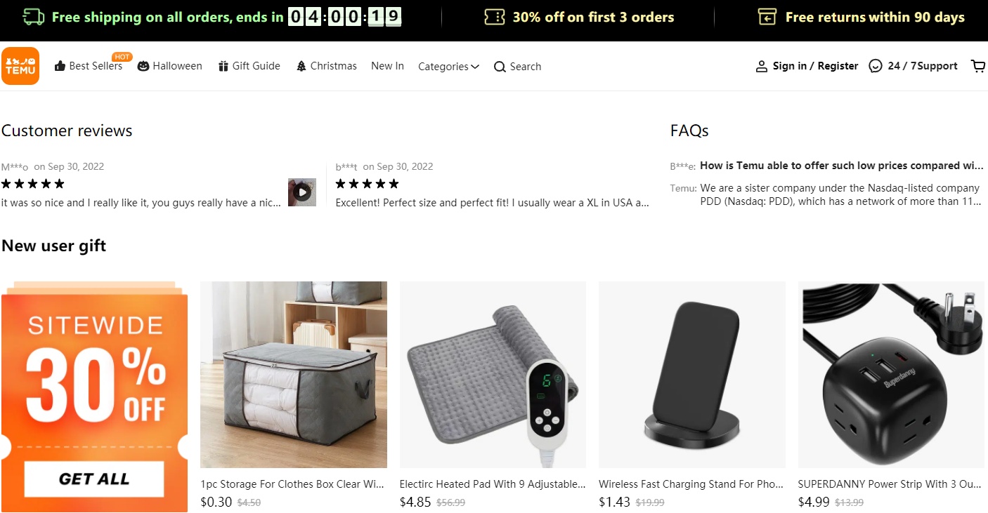 其官方介绍中写到,“Temu将以惊人的价格发现广泛的全球产品”。甚至在上线不到1个月,该平台还将新用户首单优惠从20%提高至30%,并且除了低价策略外,还推出了诸如免运费、30%折扣、免费退货这类促销政策,以及“0.01美元秒杀专区”等特惠活动。