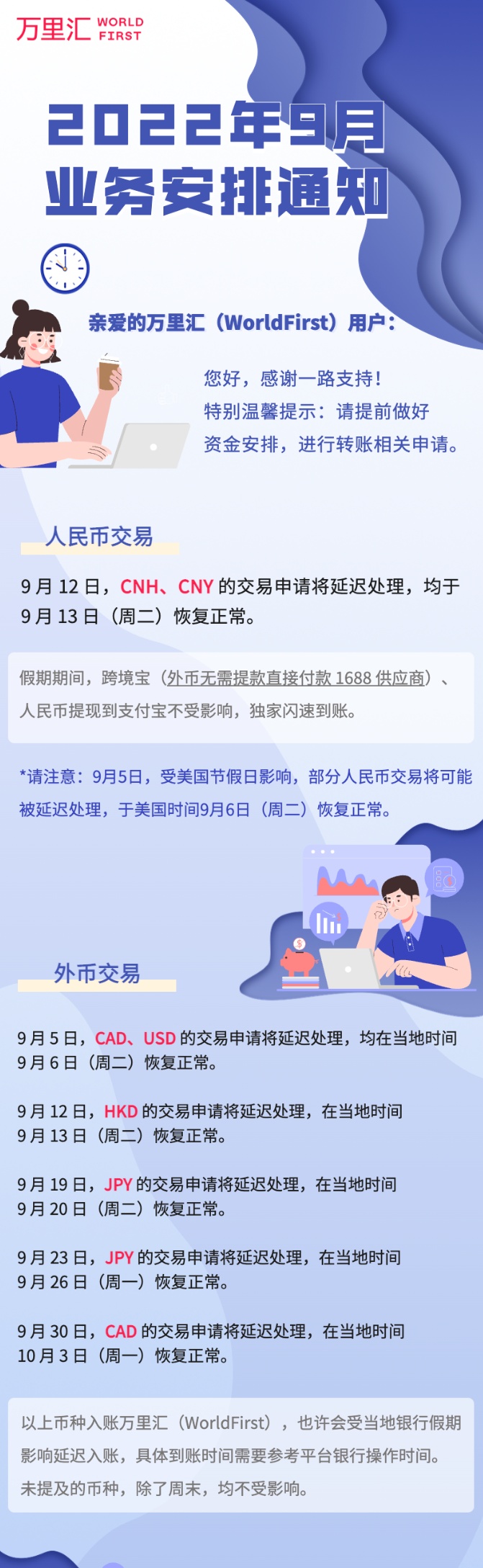此外,9月5日,受美国节假日影响,部分人民币交易可能被延迟处理,将于美国时间9月2日恢复正常。
