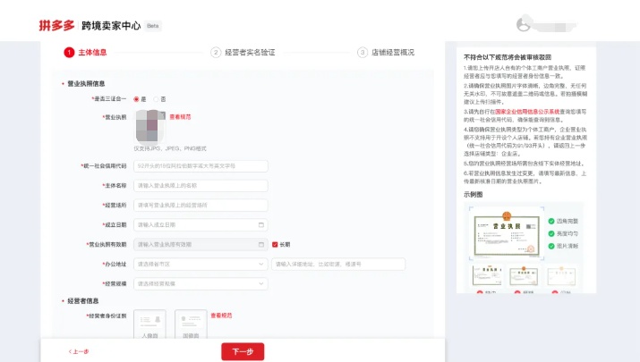 据悉,入驻拼多多北美站需要提供个体工商户营业执照,填写主体信息,并进行实名验证,填报店铺经营情况。