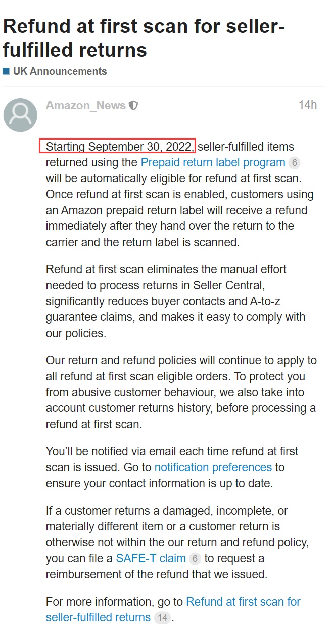 具体来说,启用首次扫描退款后,使用亚马逊预付退货标签的买家将在将退货交给承运人并扫描退货标签后立即收到退款。