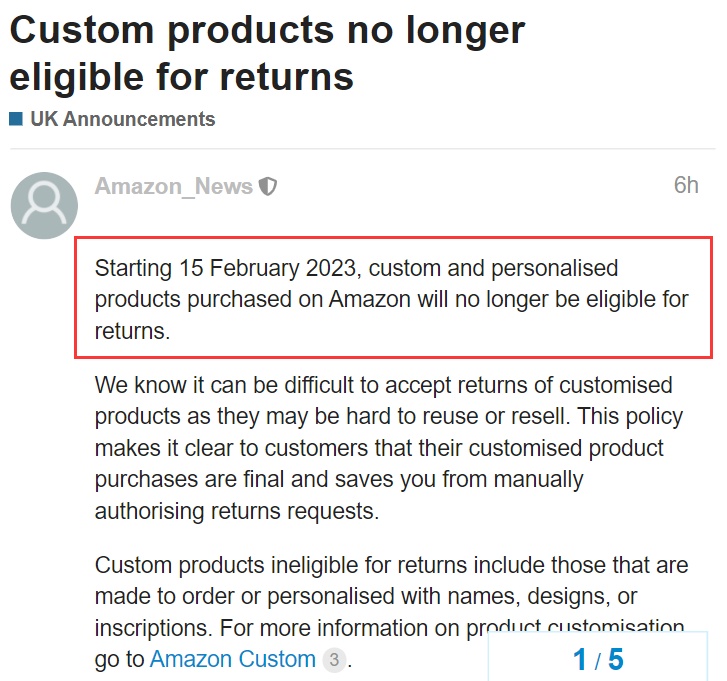 2月1日消息,亚马逊欧洲站发布公告称,从2023年2月15日开始,在亚马逊上购买的定制和个性化产品将不再符合退货条件。