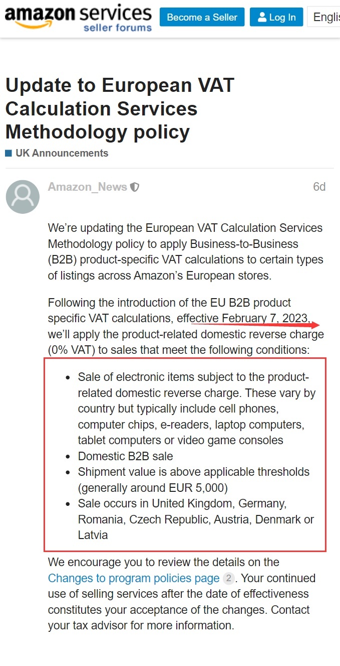 值得一提的是,亚马逊欧洲站近日发布公告称,自2023年2月7日起,引入欧盟B2B产品特定增值税计算后,亚马逊将对满足以下条件的销售应用与产品相关的国内反向征税(0%增值税):