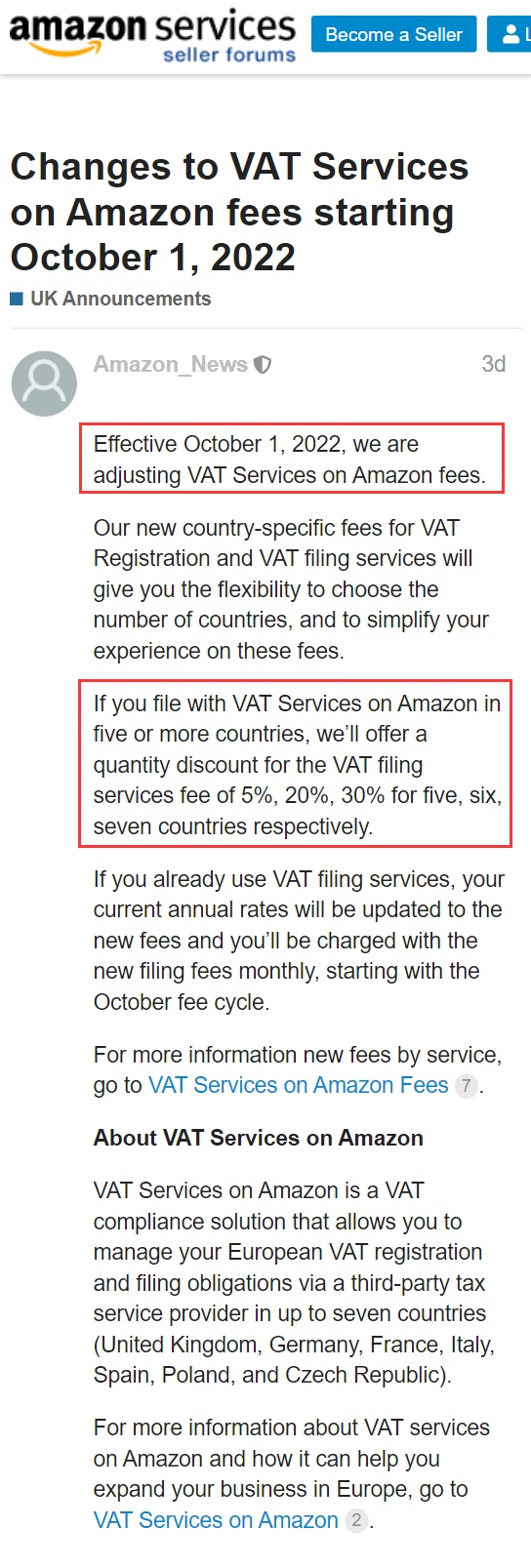 如果卖家在五个或以上国家/地区通过亚马逊增值税服务申报,亚马逊将分别为五个、六个、七个国家/地区的增值税申报服务费提供5%、20%、30%的折扣。
