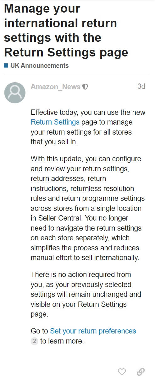 亚马逊欧洲站发布公告称,已为卖家推出了新退货设置页面,卖家可以使用新页面来管理所销售的所有店铺的退货设置。
