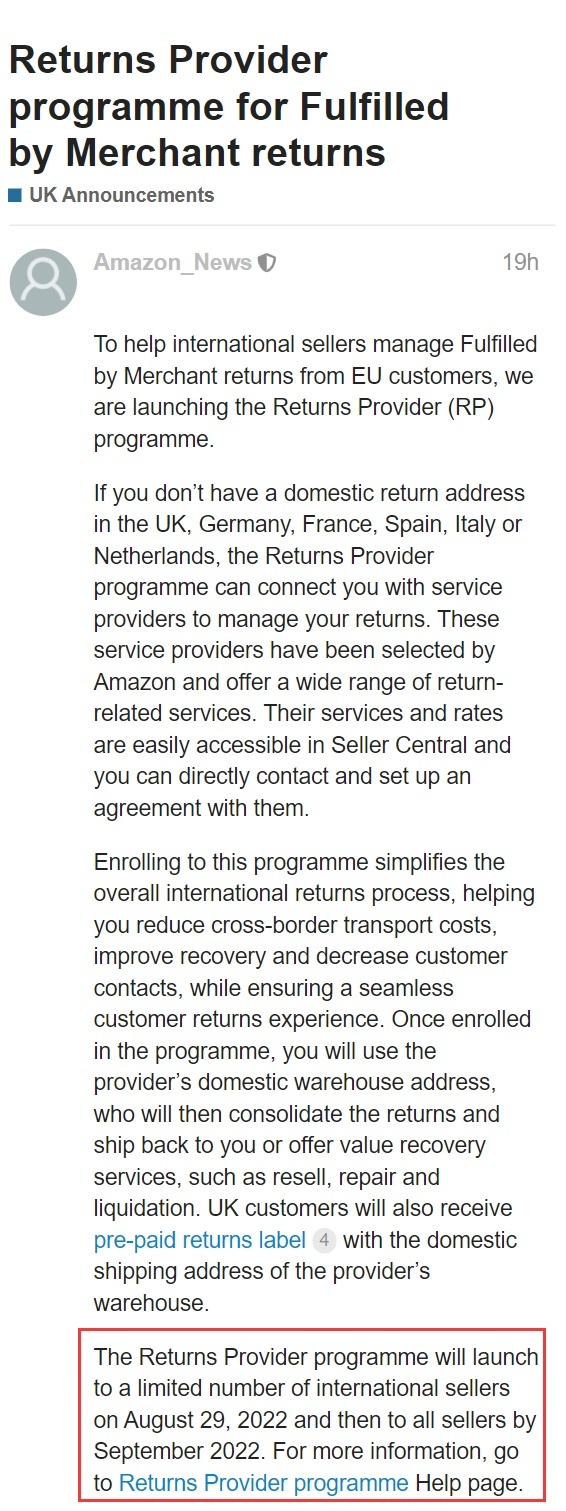 退货提供商计划将于2022年8月29日向部分国际卖家推出,并将在2022年9月之前向所有卖家推出。