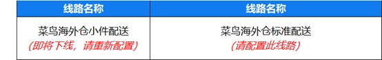 以上线路将于北京时间2023年01月16日0时正式下线,配置以上物流线路的商家请尽快将运费模板更改为:菜鸟 海外仓标准配送, 对应修改方案如下: