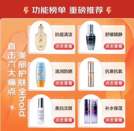 为了助力消费者科学、精准护肤,美妆2.28超级品类日发布了补水保湿、舒缓镇静、抗痘清洁、滋润防晒、美白淡斑、抗衰抗氧六大功能性榜单,按照当下消费者不同护肤需求进行产品推荐。