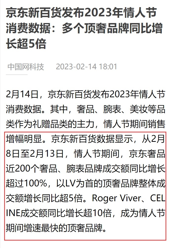 值得一提的是,此前,京东新百货发布了2023年情人节消费数据,奢品、腕表、美妆等品类作为礼赠品类的主力,情人节期间销售增幅明显。