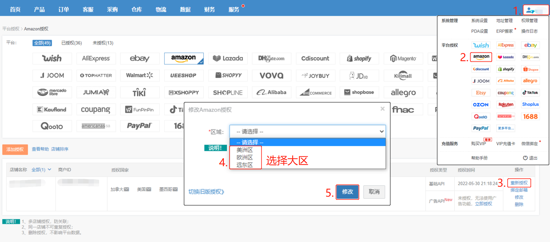 第一步:主账号—平台授权—Amazon—找到需要更新的Amazon店铺—重新授权—选择大区—点击修改